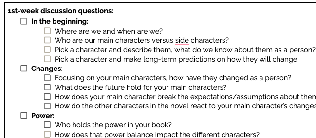 While all of the students have done book clubs multiple times before, 7th grade tends to be the first time they have to decide what they will be discussing and prepare accordingly, rather than the teacher telling them what to track. So we have a “cheat sheet” which really is just scaffolds in order to help them be successful. Some of these discussion points are learning targets from the Teachers College Dystopian Unit which we use as a foundational guidance and others are once we have discovered with book clubs throughout the years. Choice reigns supreme and it is important for us that students can steer their discussions ina natural way, they do not have to stick to these but this is a starting point.