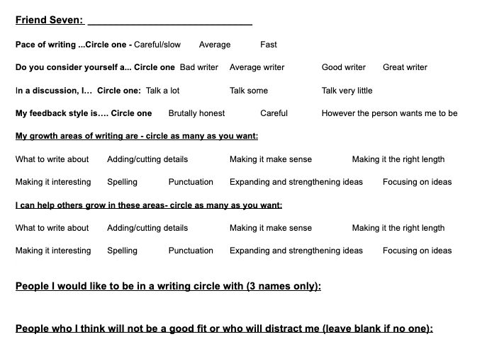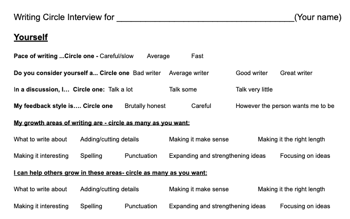 Students choose peers to be in their writing circle – 3 to 4 people through an interview.